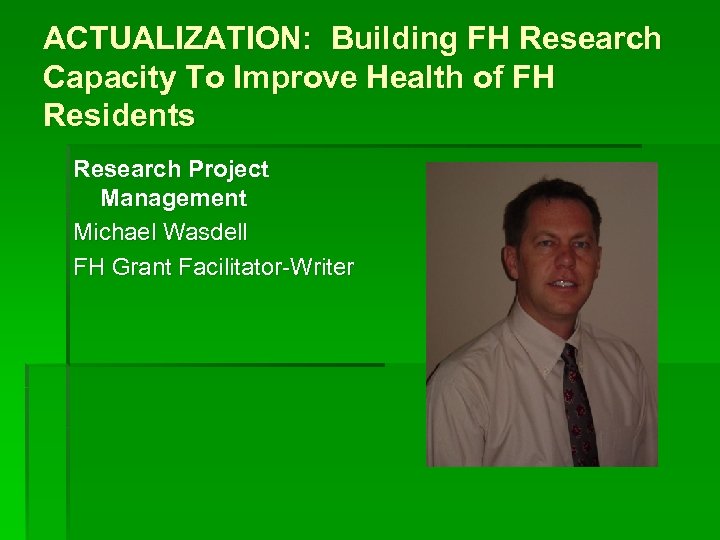 ACTUALIZATION: Building FH Research Capacity To Improve Health of FH Residents Research Project Management Michael Wasdell FH Grant Facilitator-Writer