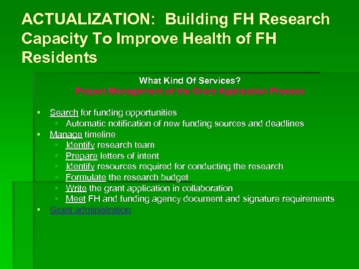 ACTUALIZATION: Building FH Research Capacity To Improve Health of FH Residents What Kind Of Services? Project Management of the Grant Application Process § Search for funding opportunities § Automatic notification of new funding sources and deadlines § Manage timeline § Identify research team § Prepare letters of intent § Identify resources required for conducting the research § Formulate the research budget § Write the grant application in collaboration § Meet FH and funding agency document and signature requirements § Grant administration