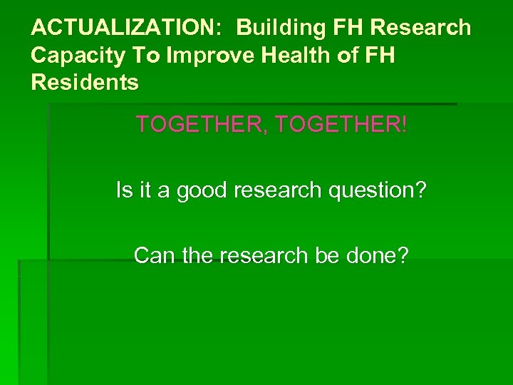 ACTUALIZATION: Building FH Research Capacity To Improve Health of FH Residents TOGETHER, TOGETHER! Is it a good research question? Can the research be done?