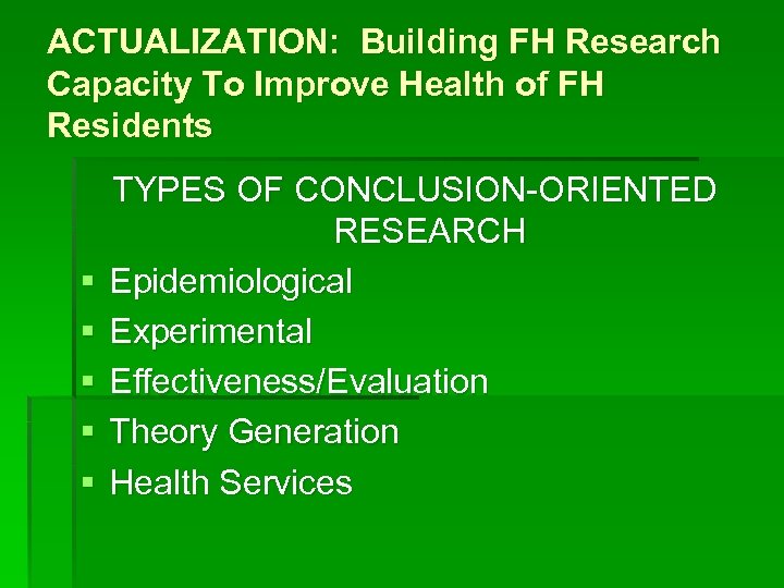 ACTUALIZATION: Building FH Research Capacity To Improve Health of FH Residents § § § TYPES OF CONCLUSION-ORIENTED RESEARCH Epidemiological Experimental Effectiveness/Evaluation Theory Generation Health Services