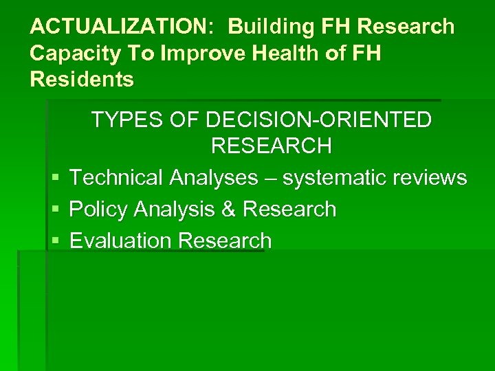 ACTUALIZATION: Building FH Research Capacity To Improve Health of FH Residents § § § TYPES OF DECISION-ORIENTED RESEARCH Technical Analyses – systematic reviews Policy Analysis & Research Evaluation Research