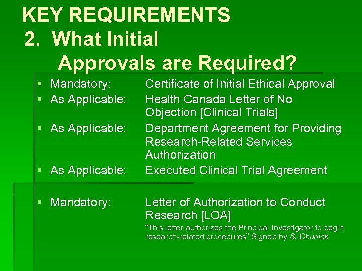KEY REQUIREMENTS 2. What Initial Approvals are Required? § Mandatory: § As Applicable: § Mandatory: Certificate of Initial Ethical Approval Health Canada Letter of No Objection [Clinical Trials] Department Agreement for Providing Research-Related Services Authorization Executed Clinical Trial Agreement Letter of Authorization to Conduct Research [LOA] “This letter authorizes the Principal Investigator to begin research-related procedures” Signed by S. Chunick
