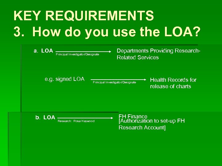 KEY REQUIREMENTS 3. How do you use the LOA? a. LOA Principal Investigator/Designate e. g. signed LOA b. LOA Departments Providing Research. Related Services Principal Investigator/Designate Research: Rosa Haywood Health Records for release of charts FH Finance [Authorization to set-up FH Research Account]