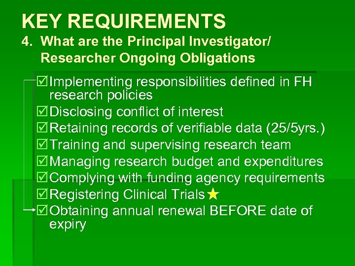 KEY REQUIREMENTS 4. What are the Principal Investigator/ Researcher Ongoing Obligations þ Implementing responsibilities defined in FH research policies þ Disclosing conflict of interest þ Retaining records of verifiable data (25/5 yrs. ) þ Training and supervising research team þ Managing research budget and expenditures þ Complying with funding agency requirements þ Registering Clinical Trials þ Obtaining annual renewal BEFORE date of expiry