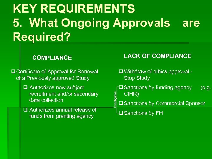 KEY REQUIREMENTS 5. What Ongoing Approvals are Required? LACK OF COMPLIANCE q Withdraw of ethics approval Stop Study q Authorizes new subject recruitment and/or secondary data collection q Sanctions by funding agency CIHR) q Authorizes annual release of funds from granting agency Investigation q Certificate of Approval for Renewal of a Previously approved Study (e. g. q Sanctions by Commercial Sponsor q Sanctions by FH