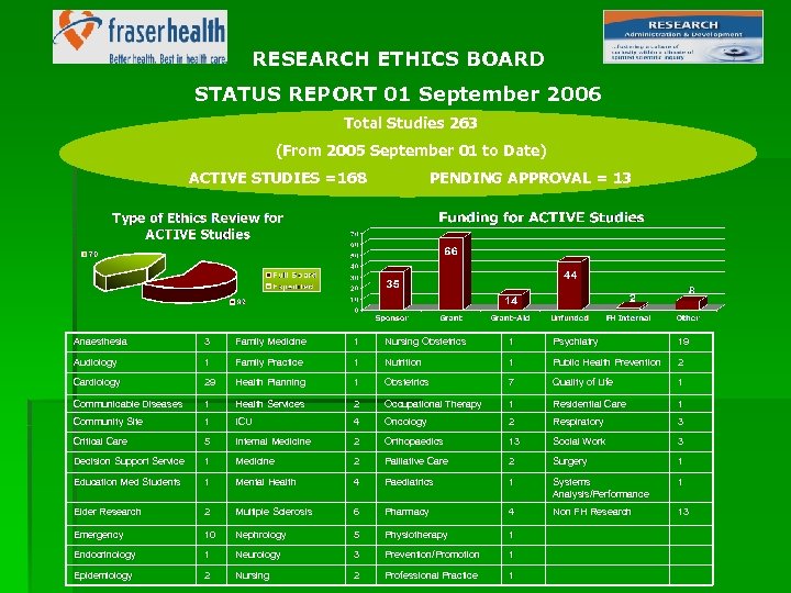 RESEARCH ETHICS BOARD STATUS REPORT 01 September 2006 Total Studies 263 (From 2005 September 01 to Date) ACTIVE STUDIES =168 PENDING APPROVAL = 13 Anaesthesia 3 Family Medicine 1 Nursing Obstetrics 1 Psychiatry 19 Audiology 1 Family Practice 1 Nutrition 1 Public Health Prevention 2 Cardiology 29 Health Planning 1 Obstetrics 7 Quality of Life 1 Communicable Diseases 1 Health Services 2 Occupational Therapy 1 Residential Care 1 Community Site 1 ICU 4 Oncology 2 Respiratory 3 Critical Care 5 Internal Medicine 2 Orthopaedics 13 Social Work 3 Decision Support Service 1 Medicine 2 Palliative Care 2 Surgery 1 Education Med Students 1 Mental Health 4 Paediatrics 1 Systems Analysis/Performance 1 Elder Research 2 Multiple Sclerosis 6 Pharmacy 4 Non FH Research 13 Emergency 10 Nephrology 5 Physiotherapy 1 Endocrinology 1 Neurology 3 Prevention/Promotion 1 Epidemiology 2 Nursing 2 Professional Practice 1