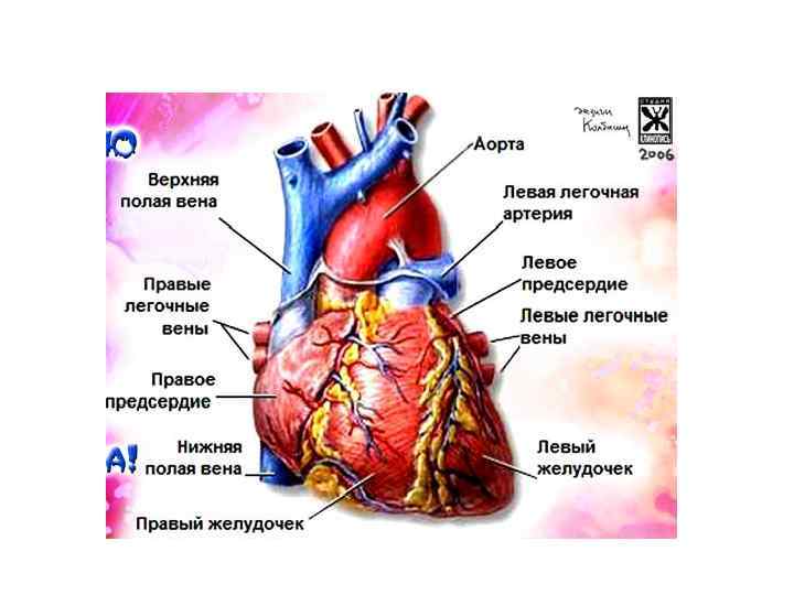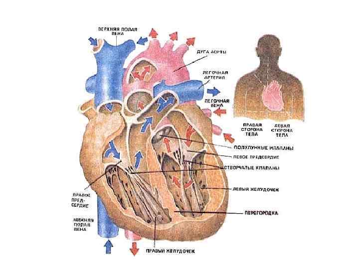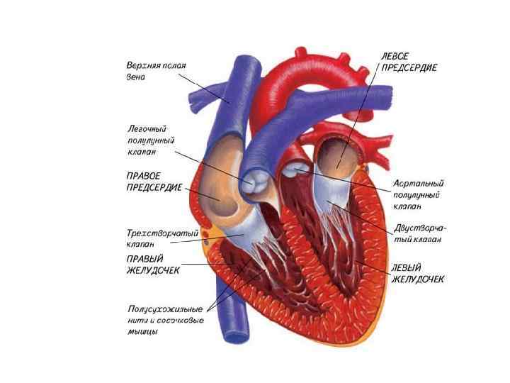 Кровоток в сердце • В правое предсердие по верхней и нижней полым венам поступает венозная кровь. Пройдя через правое предсердно-желудочковое отверстие, по краям которого укреплен трехстворчатый клапан, кровь попадает в правый желудочек, а из него - в легочные артерии. В левое предсердие впадают легочные вены, несущие артериальную кровь. Она проходит левое предсердно-желудочковое отверстие, по краям которого прикрепляется двустворчатый клапан, попадает в левый желудочек, а из него в самую большую артерию - аорту.