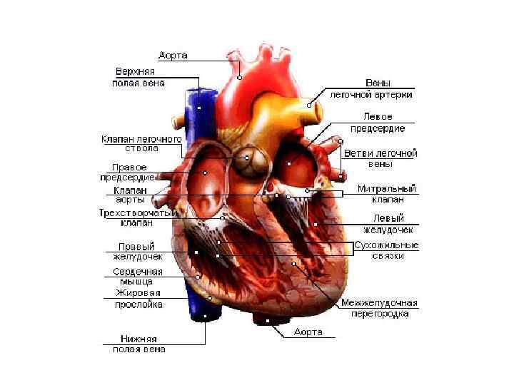 Сердце покрыто плотной фиброзной оболочкой - перикардом, образующим серозную полость, заполненную небольшим количеством жидкости, что предотвращает трение при его сокращении. Сердце состоит из двух пар камер - предсердий и желудочков, которые действуют как самостоятельные насосы. Правая половина сердца "прокачивает" венозную, богатую углекислым газом кровь, через легкие; это - малый круг кровообращения. Левая половина выбрасывает насыщенную кислородом кровь, поступившую из легких, в большой круг кровообращения. Венозная кровь из верхней и нижней полых вен попадает в правое предсердие. Четыре легочные вены доставляют артериальную кровь в левое предсердие. Атриовентрикулярные клапаны имеют особые сосочковые мышцы и тонкие сухожильные нити, закрепленные на концах заостренных краев клапанов. Эти образования фиксируют клапаны и предотвращают их "проваливание" (пролапс) обратно в предсердия во время систолы желудочков. Левый желудочек образован более толстыми мышечными волокнами, чем правый, так как он противостоит более высокому давлению крови в большом круге кровообращения и должен совершать большую работу по его преодолению во время систолы.