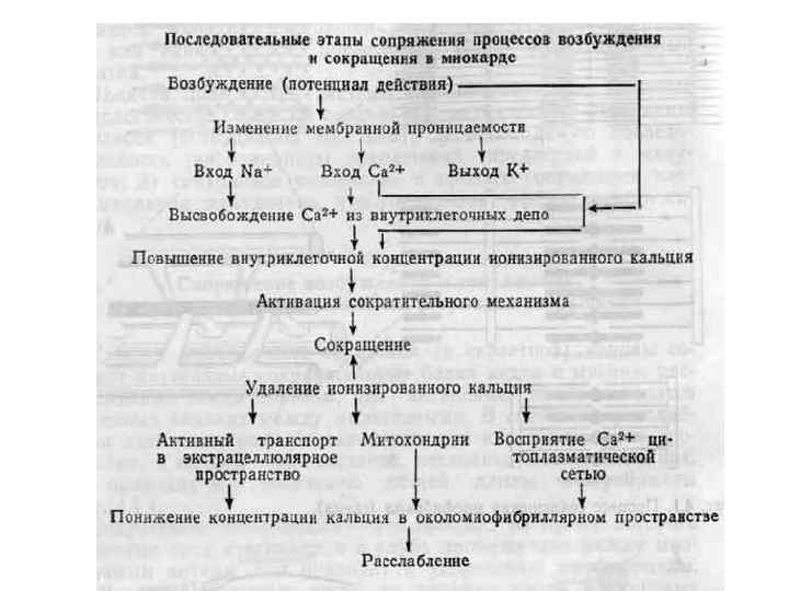 Сопряжение (связь) возбуждения и сокращения в миокарде принципиально проходит так же, как и в скелетных мышцах. То есть, ПД вызывает сокращение так: • ПД распространяется по мембране Т-трубочек • открытие кальциевых каналов саркоплазматического ретикулума (СПР) выход ионов кальция из СПР • увеличение концентрации ионов кальция в миоплазми с 10 -8 прежде 10 -5 моль / л • диффузия ионов кальция в сократительных белков (протофибрилл) • взаимодействие с регуляторными белками (с тропонином) • изменение третичной структуры тропонина и тропомиозином • открытия активных центров актина • взаимодействие активных головок миозина с активными центрами актина сокращения миокарда.