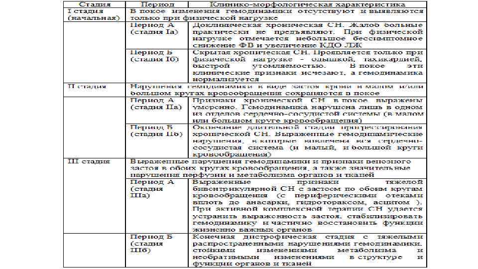 В РФ ИСПОЛЬЗУЮТСЯ ДВЕ КЛАССИФИКАЦИИ ХРОНИЧЕСКОЙ СН, КОТОРЫЕ СУЩЕСТВЕННО ДОПОЛНЯЮТ ДРУГА. ОДНА ИЗ НИХ, СОЗДАННАЯ Н. Д. СТРАЖЕСКО И В. Х. ВАСИЛЕНКО ПРИ УЧАСТИИ Г. Ф. ЛАНГА И УТВЕРЖДЕННАЯ НА ХII ВСЕСОЮЗНОМ СЪЕЗДЕ ТЕРАПЕВТОВ (1935), ОСНОВАНА НА ФУНКЦИОНАЛЬНОМОРФОЛОГИЧЕСКИХ ПРИНЦИПАХ ОЦЕНКИ ДИНАМИКИ КЛИНИЧЕСКИХ ПРОЯВЛЕНИЙ СН (ТАБЛИЦА 48). КЛАССИФИКАЦИЯ ПРИВЕДЕНА С СОВРЕМЕННЫМИ ДОПОЛНЕНИЯМИ Н. М. МУХАРЛЯМОВА, Л. И. ОЛЬБИНСКОЙ (2001).