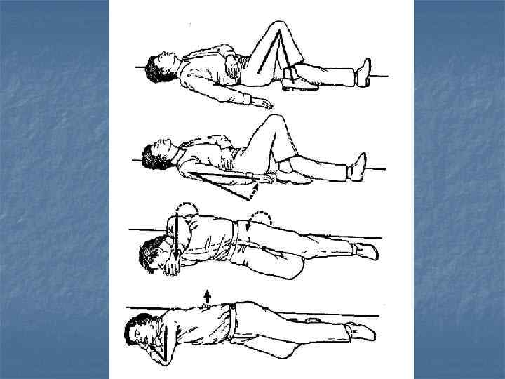 Позиция больного при проведении реанимационных мероприятий n Поворачивать больного как "единое целое", не допуская перемещения частей тела относительно друга или их вращения n При проведении реанимационных мероприятий больной должен лежать на твердой ровной поверхности на спине, руки вытянуты вдоль тела n В отсутствие сознания, но при наличии самостоятельного дыхания и пульсации на крупных артериях больной может быть уложен в устойчивую позицию на боку (если не подозревается травма)