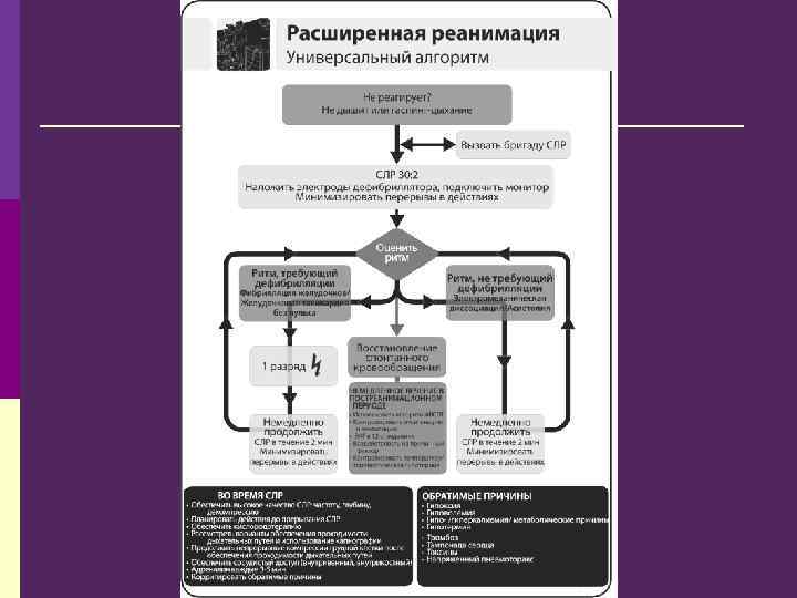 Ритм поддаётся ЭД При развитии асистолии – переход к другому алгоритму p При восстановлении ритма – ведение постреанимационного периода p При сомнении в наличии пульса – продолжить СЛР p Своевременно корригировать: гипоксию, p гиповолемию, гипер-/гипокалиемию, гипокальциемию, ацидоз, гипотермия, напряженный пневмоторакс, тампонаду сердца…