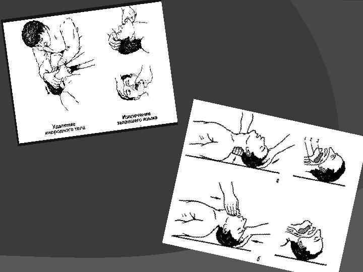 Этапы проведения сердечно - легочной реанимации I этап—восстановление проходимости дыхательных путей. Пострадавшего или больного необходимо уложить на спину на твердую поверхность, повернуть голову набок, скрещенными I и II пальцами правой руки раскрыть рот и очистить полость рта носовым платком или салфеткой, намотанными на II или III пальцы левой руки. Затем голову повернуть прямо и максимально запрокинуть назад. При этом одна рука размещается под шеей, другая располагается на лбу и фиксирует голову в запрокинутом виде. При отгибании головы назад нижняя челюсть оттесняется вверх вместе с корнем языка, что восстанавливает проходимость дыхательных путей.