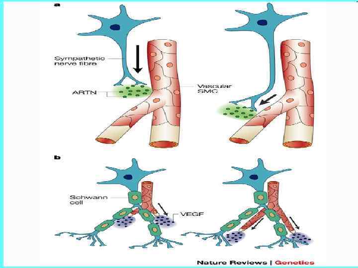 Сосуды растут одновременно с нервами Нейротрофический сигнал от ГМК Ангиотрофический сигнал от глиоцитов Шванна Nature Reviews Genetics 4, 710 -720, 2003