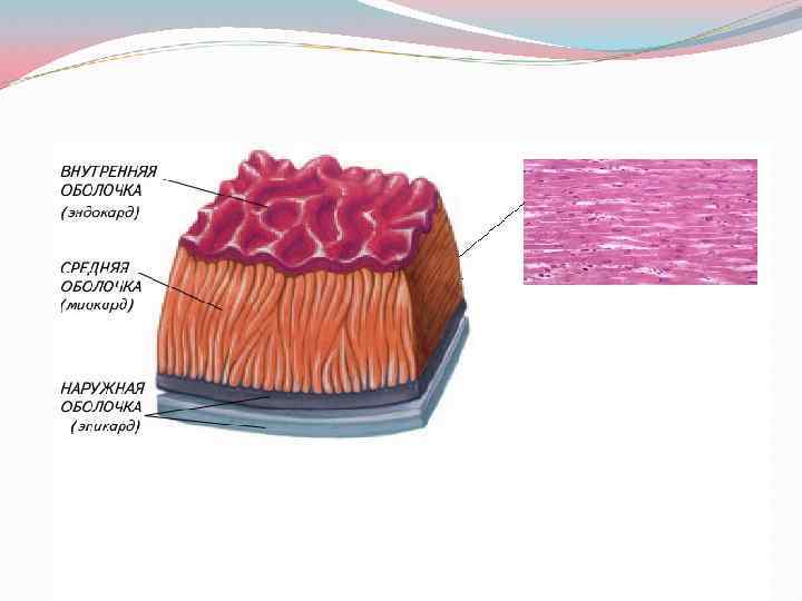 Строение сердечной стенки Стенки сердца состоят из 3 оболочек: 1. Эндокард тонкий внутренний слой, выстилающий полость сердца изнутри, в точности повторяя ее сложный рельеф. Эндокард образован одним слоем плоских эндотелиоцитов, расположенных на тонкой базальной мембране. 2. Миокард толстый мышечный слой, образованный сердечной поперечно полосатой мышечной тканью и состоит из сердечных миоцитов, соединенных между собой большим количеством перемычек, с помощью которых они связаны в мышечные комплексы. Обеспечивает ритмичное сокращение предсердий и желудочков. 3. Эпикард тонкий наружный слой, построен по типу серозных оболочек и состоит из тонкой пластинки соединительной ткани, покрытой мезотелием. Эпикард покрывает сердце, начальные отделы восходящей части аорты и легочного ствола, конечные отделы полых и легочных вен.
