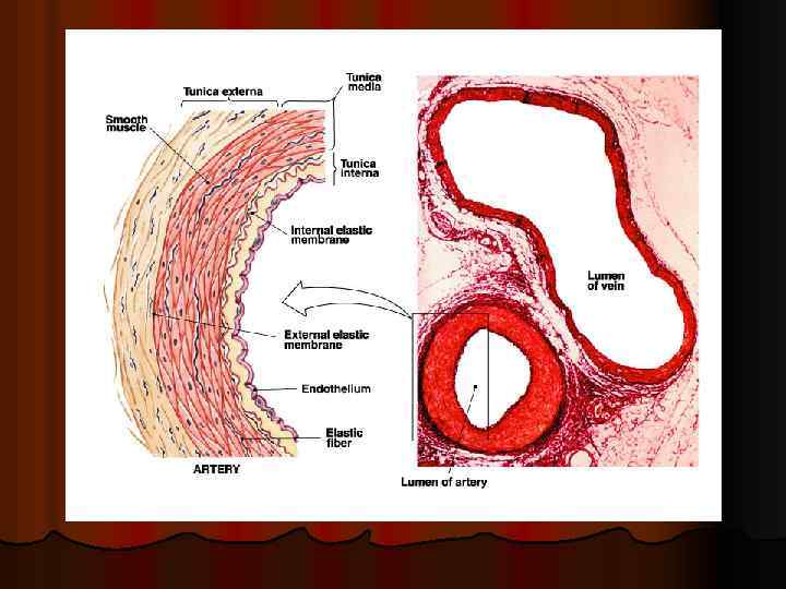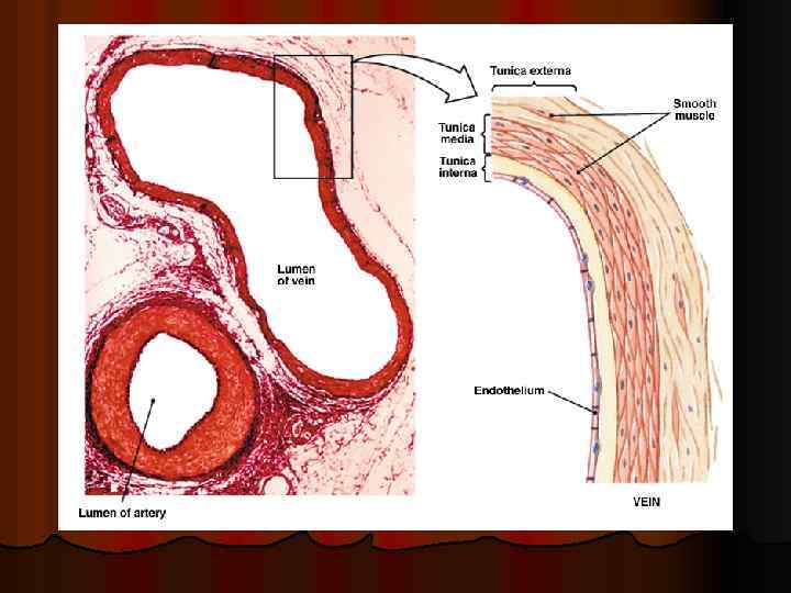 Строение артерий и вен 3 слоя (за исключением капилляров и венул) l Интима (внутренний слой) l l Эндотелий Средняя оболочка l Адвентиций (наружный слой) l l Срастается с соед. тк. , окружающей сосуды