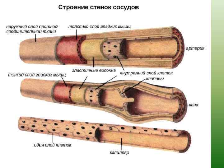 Строение кровеносных сосудов ØИнтима - эндотелиальные клетки; ØМедиа - гладкая мышечная ткань; ØАдвентиция соединительная ткань.