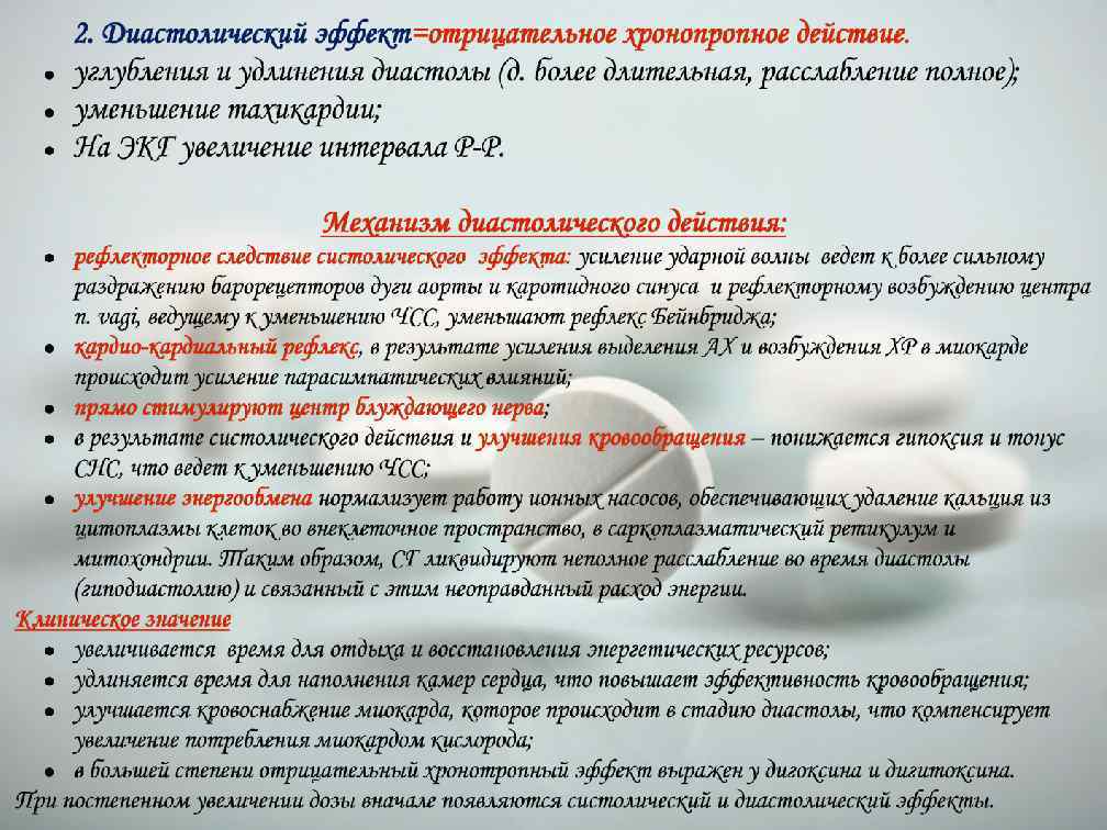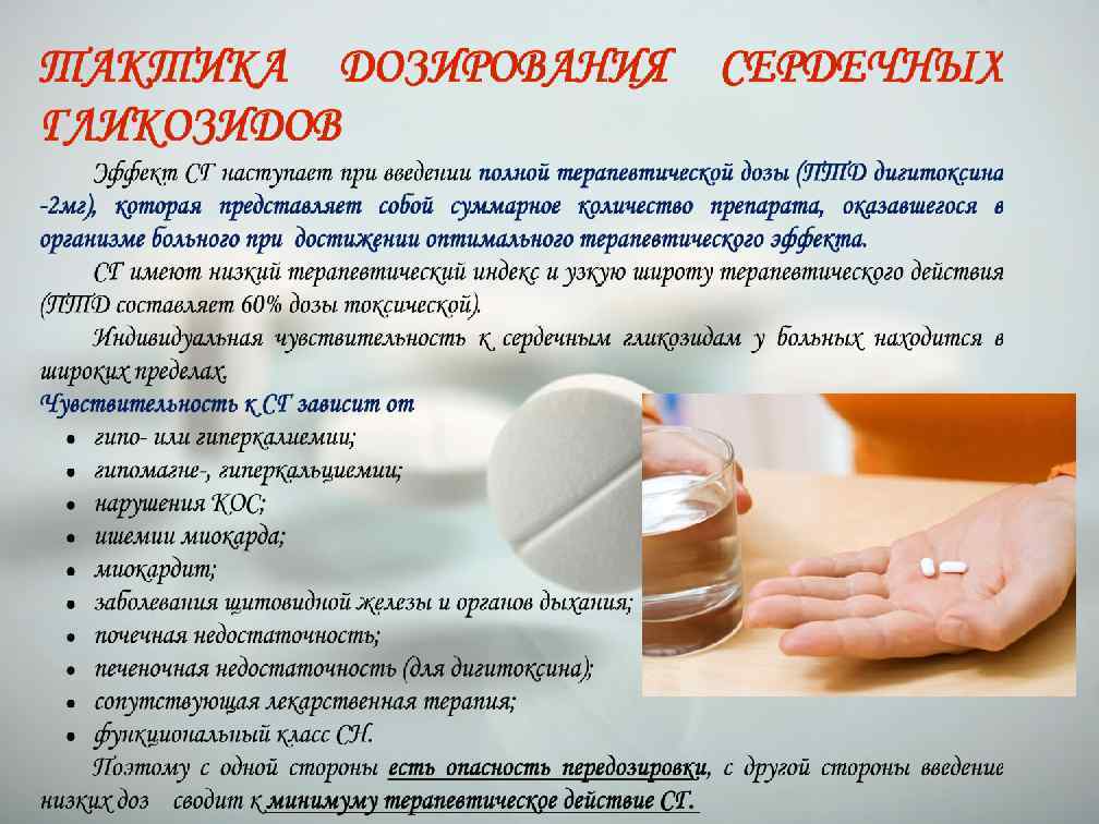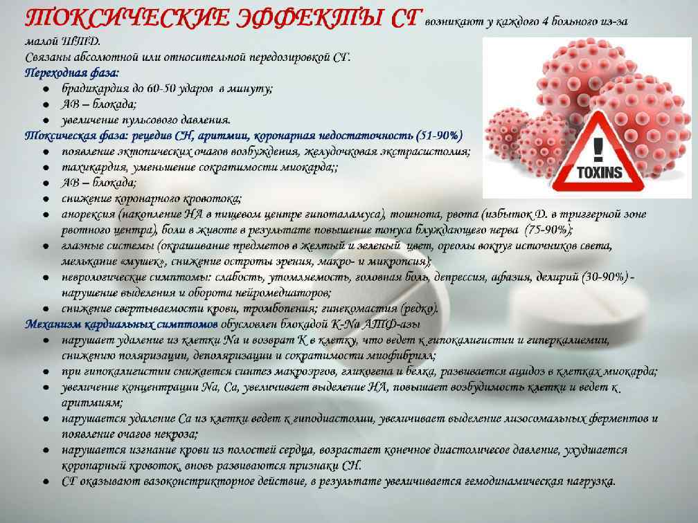 Сердечные гликозиды имеют ряд особенностей в действии: • проявляют свой эффект в полной мере только на больном сердце (на здоровое действуют в токсических дозах); • имеют малую широту терапевтического действия (ТД составляет 60% от токсической); • эффект наступает «скачкообразно» при введении в организм полной эффективной дозы АДОНИЗИД