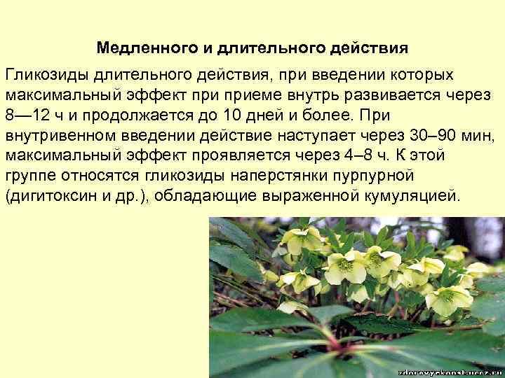 Медленного и длительного действия Гликозиды длительного действия, при введении которых максимальный эффект приеме внутрь развивается через 8— 12 ч и продолжается до 10 дней и более. При внутривенном введении действие наступает через 30– 90 мин, максимальный эффект проявляется через 4– 8 ч. К этой группе относятся гликозиды наперстянки пурпурной (дигитоксин и др. ), обладающие выраженной кумуляцией.