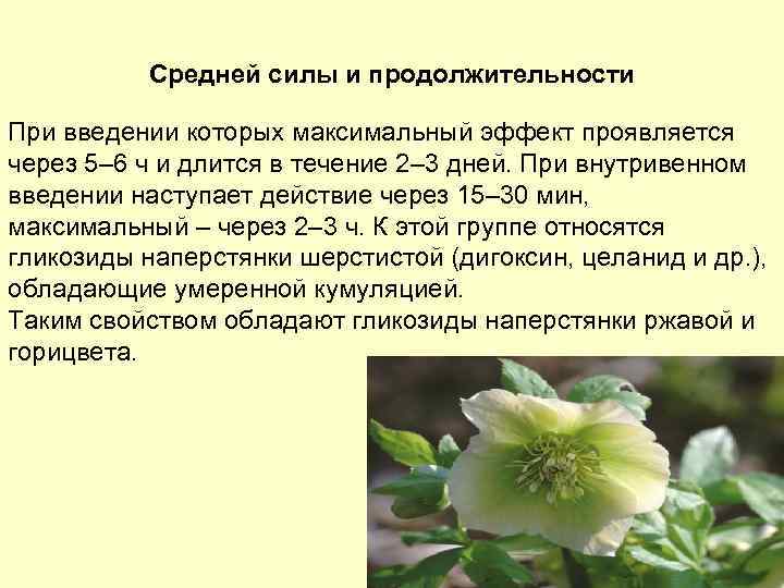 Средней силы и продолжительности При введении которых максимальный эффект проявляется через 5– 6 ч и длится в течение 2– 3 дней. При внутривенном введении наступает действие через 15– 30 мин, максимальный – через 2– 3 ч. К этой группе относятся гликозиды наперстянки шерстистой (дигоксин, целанид и др. ), обладающие умеренной кумуляцией. Таким свойством обладают гликозиды наперстянки ржавой и горицвета.