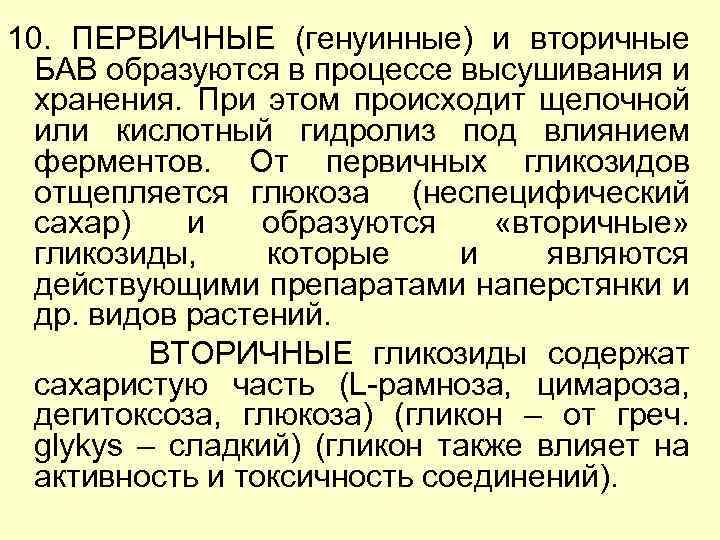 10. ПЕРВИЧНЫЕ (генуинные) и вторичные БАВ образуются в процессе высушивания и хранения. При этом происходит щелочной или кислотный гидролиз под влиянием ферментов. От первичных гликозидов отщепляется глюкоза (неспецифический сахар) и образуются «вторичные» гликозиды, которые и являются действующими препаратами наперстянки и др. видов растений. ВТОРИЧНЫЕ гликозиды содержат сахаристую часть (L-рамноза, цимароза, дегитоксоза, глюкоза) (гликон – от греч. glykys – сладкий) (гликон также влияет на активность и токсичность соединений).