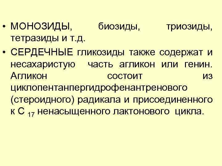 • МОНОЗИДЫ, биозиды, триозиды, тетразиды и т. д. • СЕРДЕЧНЫЕ гликозиды также содержат и несахаристую часть агликон или генин. Агликон состоит из циклопентанпергидрофенантренового (стероидного) радикала и присоединенного к С 17 ненасыщенного лактонового цикла.