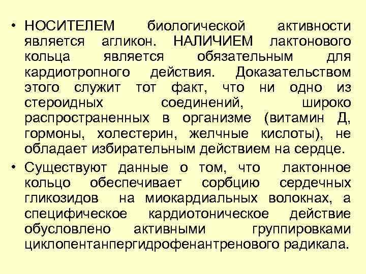 • НОСИТЕЛЕМ биологической активности является агликон. НАЛИЧИЕМ лактонового кольца является обязательным для кардиотропного действия. Доказательством этого служит тот факт, что ни одно из стероидных соединений, широко распространенных в организме (витамин Д, гормоны, холестерин, желчные кислоты), не обладает избирательным действием на сердце. • Существуют данные о том, что лактонное кольцо обеспечивает сорбцию сердечных гликозидов на миокардиальных волокнах, а специфическое кардиотоническое действие обусловлено активными группировками циклопентанпергидрофенантренового радикала.