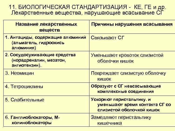 11. БИОЛОГИЧЕСКАЯ СТАНДАРТИЗАЦИЯ - КЕ, ГЕ и др. Лекарственные вещества, нарушающие всасывание СГ Название лекарственных веществ Причины нарушения всасывания 1. Антациды, содержащие алюминий (альмагель, гидроокись алюминия) Связывают СГ 2. Сосудосуживающие средства (норадреналин, мезатон, ангиотензин). Уменьшают кровоток слизистой оболочки кишок 3. Неомицин Повреждает слизистую оболочку кишок 4. Тетроциклины Образуют с СГ невсасывающие комплексные соединения 5. Слабительные Ускоряют перистальтику. и уменьшают время контакта СГ со слизистой оболочкой кишок 6. Ганглиоблокаторы, М- Замедляют перистальтику кишечника холиноблокаторы