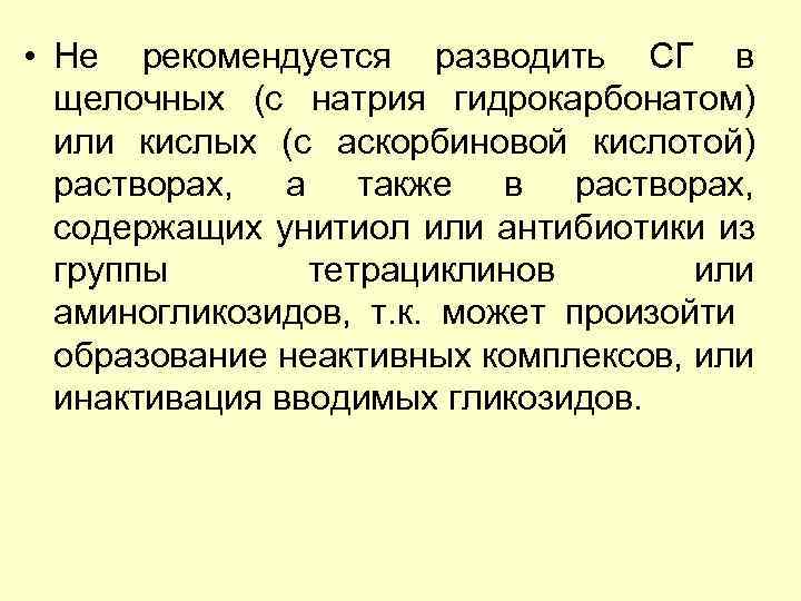 • Не рекомендуется разводить СГ в щелочных (с натрия гидрокарбонатом) или кислых (с аскорбиновой кислотой) растворах, а также в растворах, содержащих унитиол или антибиотики из группы тетрациклинов или аминогликозидов, т. к. может произойти образование неактивных комплексов, или инактивация вводимых гликозидов.