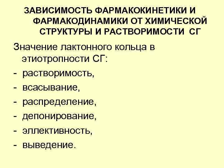 ЗАВИСИМОСТЬ ФАРМАКОКИНЕТИКИ И ФАРМАКОДИНАМИКИ ОТ ХИМИЧЕСКОЙ СТРУКТУРЫ И РАСТВОРИМОСТИ СГ Значение лактонного кольца в этиотропности СГ: - растворимость, - всасывание, - распределение, - депонирование, - эллективность, - выведение.