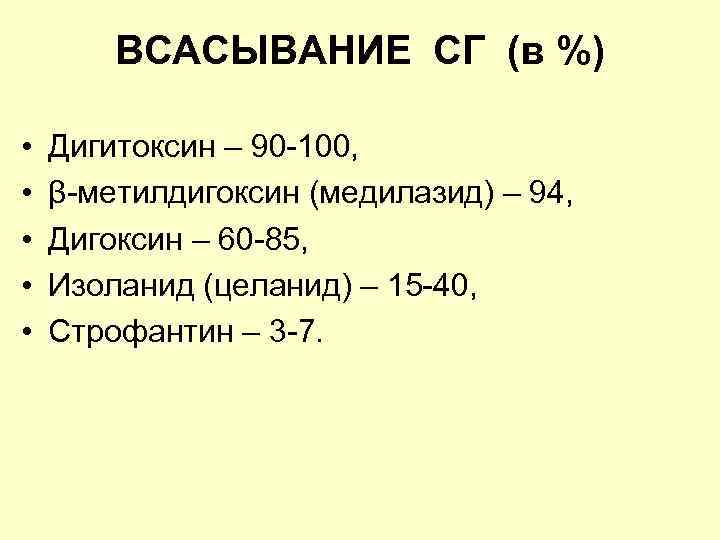 ВСАСЫВАНИЕ СГ (в %) • • • Дигитоксин – 90 -100, β-метилдигоксин (медилазид) – 94, Дигоксин – 60 -85, Изоланид (целанид) – 15 -40, Строфантин – 3 -7.