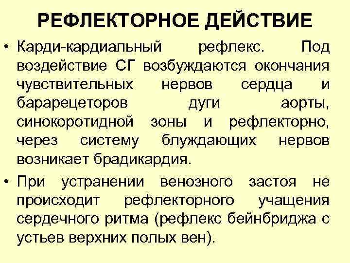 РЕФЛЕКТОРНОЕ ДЕЙСТВИЕ • Карди-кардиальный рефлекс. Под воздействие СГ возбуждаются окончания чувствительных нервов сердца и барарецеторов дуги аорты, синокоротидной зоны и рефлекторно, через систему блуждающих нервов возникает брадикардия. • При устранении венозного застоя не происходит рефлекторного учащения сердечного ритма (рефлекс бейнбриджа с устьев верхних полых вен).
