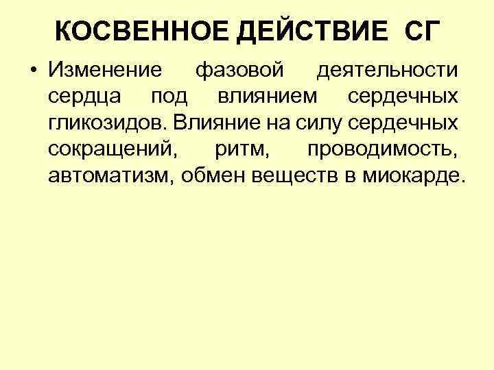 КОСВЕННОЕ ДЕЙСТВИЕ СГ • Изменение фазовой деятельности сердца под влиянием сердечных гликозидов. Влияние на силу сердечных сокращений, ритм, проводимость, автоматизм, обмен веществ в миокарде.
