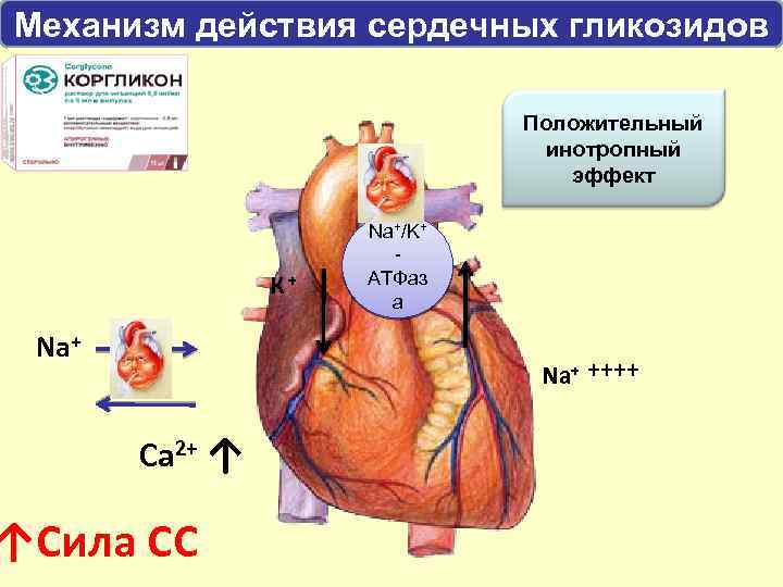 • ЭТОТ ПОНИЖЕННЫЙ трансмембранный обмен снижает интенсивность выведения Са²⁺, что способствует увеличению содержания Са²⁺ в саркоплазме и накоплению его в саркоплазматическом ретикулёме. В свою очередь это стимулирует поступление из вне дополнительных количеств Са²⁺ в кардиомиоциты через кальциевые L-каналы. На этом фоне потенциалом действия вызывает повышенное высвобождение Са²⁺ из саркоплазматического ретикулума. При этом увеличивается содержание свободных ионов Са²⁺ в саркоплазме, что и обеспечивает кардиотонический эффект.