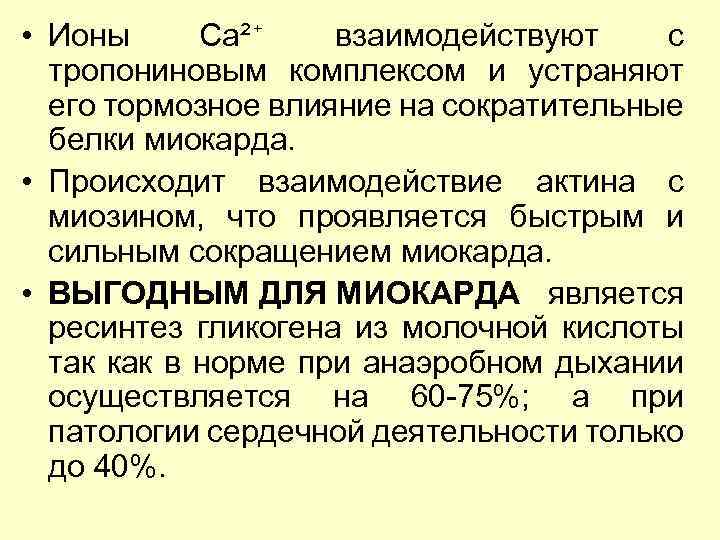 • Ионы Са²⁺ взаимодействуют с тропониновым комплексом и устраняют его тормозное влияние на сократительные белки миокарда. • Происходит взаимодействие актина с миозином, что проявляется быстрым и сильным сокращением миокарда. • ВЫГОДНЫМ ДЛЯ МИОКАРДА является ресинтез гликогена из молочной кислоты так как в норме при анаэробном дыхании осуществляется на 60 -75%; а при патологии сердечной деятельности только до 40%.
