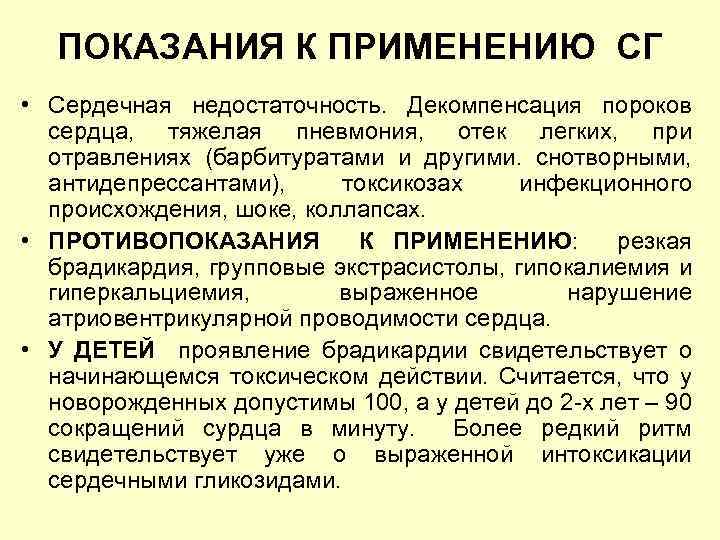 ПОКАЗАНИЯ К ПРИМЕНЕНИЮ СГ • Сердечная недостаточность. Декомпенсация пороков сердца, тяжелая пневмония, отек легких, при отравлениях (барбитуратами и другими. снотворными, антидепрессантами), токсикозах инфекционного происхождения, шоке, коллапсах. • ПРОТИВОПОКАЗАНИЯ К ПРИМЕНЕНИЮ: резкая брадикардия, групповые экстрасистолы, гипокалиемия и гиперкальциемия, выраженное нарушение атриовентрикулярной проводимости сердца. • У ДЕТЕЙ проявление брадикардии свидетельствует о начинающемся токсическом действии. Считается, что у новорожденных допустимы 100, а у детей до 2 -х лет – 90 сокращений сурдца в минуту. Более редкий ритм свидетельствует уже о выраженной интоксикации сердечными гликозидами.