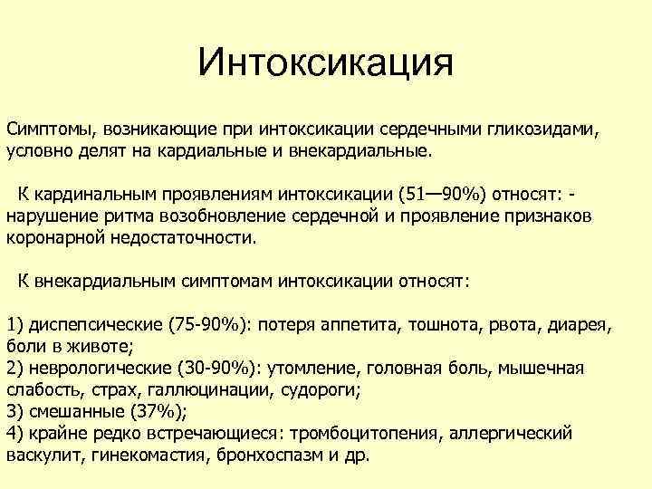 Интоксикация Симптомы, возникающие при интоксикации сердечными гликозидами, условно делят на кардиальные и внекардиальные. К кардинальным проявлениям интоксикации (51— 90%) относят: - нарушение ритма возобновление сердечной и проявление признаков коронарной недостаточности. К внекардиальным симптомам интоксикации относят: 1) диспепсические (75 -90%): потеря аппетита, тошнота, рвота, диарея, боли в животе; 2) неврологические (30 -90%): утомление, головная боль, мышечная слабость, страх, галлюцинации, судороги; 3) смешанные (37%); 4) крайне редко встречающиеся: тромбоцитопения, аллергический васкулит, гинекомастия, бронхоспазм и др.