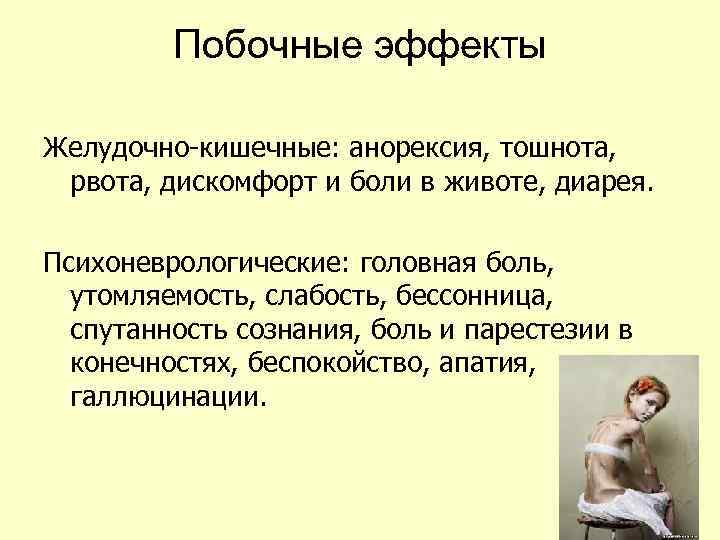 Побочные эффекты Желудочно-кишечные: анорексия, тошнота, рвота, дискомфорт и боли в животе, диарея. Психоневрологические: головная боль, утомляемость, слабость, бессонница, спутанность сознания, боль и парестезии в конечностях, беспокойство, апатия, галлюцинации.