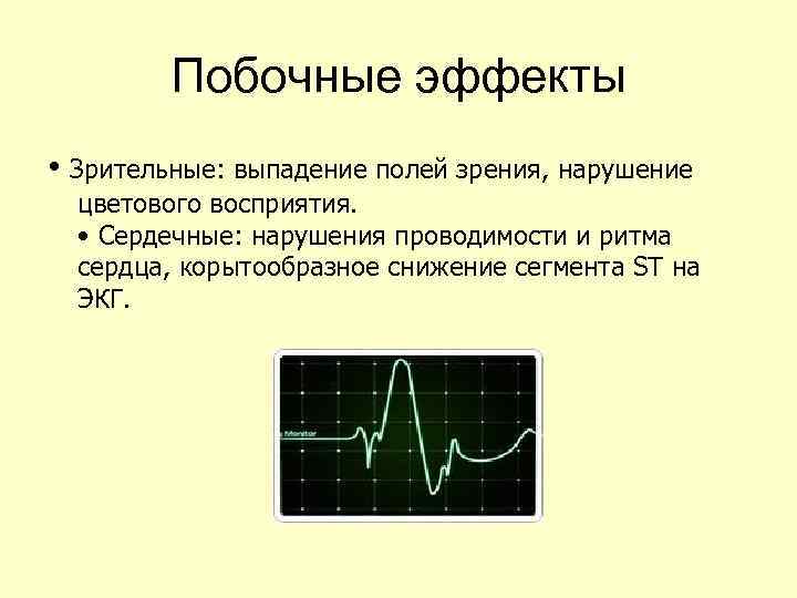 Побочные эффекты • Зрительные: выпадение полей зрения, нарушение цветового восприятия. • Сердечные: нарушения проводимости и ритма сердца, корытообразное снижение сегмента ST на ЭКГ.