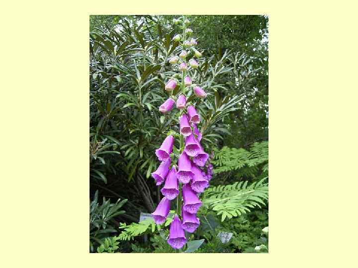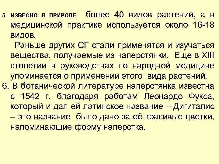 5. ИЗВЕСНО В ПРИРОДЕ более 40 видов растений, а в медицинской практике используется около 16 -18 видов. Раньше других СГ стали применятся и изучаться вещества, получаемые из наперстянки. Еще в ХIII столетии в руководствах по народной медицине упоминается о применении этого вида растений. 6. В ботанической литературе наперстянка известна с 1542 г. благодаря работам Леонардо Фукса, который и дал ей латинское название – Дигиталис – это название было дано за её красивые цветки, напоминающие форму наперстка.