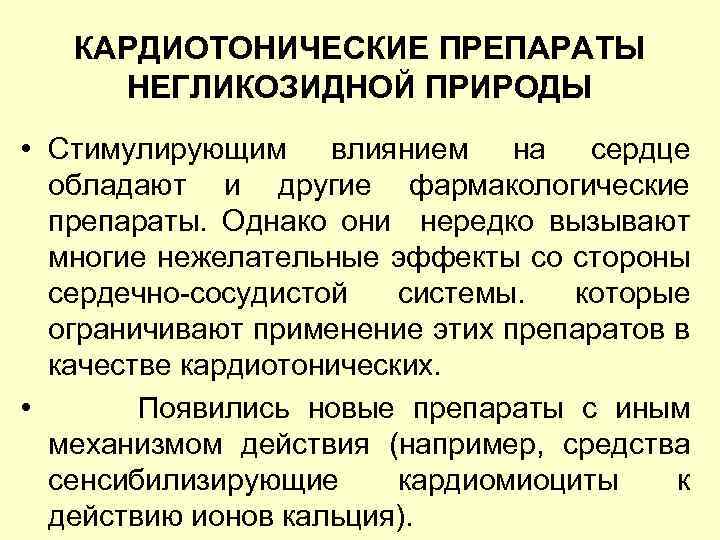КАРДИОТОНИЧЕСКИЕ ПРЕПАРАТЫ НЕГЛИКОЗИДНОЙ ПРИРОДЫ • Стимулирующим влиянием на сердце обладают и другие фармакологические препараты. Однако они нередко вызывают многие нежелательные эффекты со стороны сердечно-сосудистой системы. которые ограничивают применение этих препаратов в качестве кардиотонических. • Появились новые препараты с иным механизмом действия (например, средства сенсибилизирующие кардиомиоциты к действию ионов кальция).
