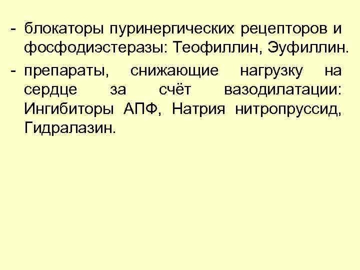 - блокаторы пуринергических рецепторов и фосфодиэстеразы: Теофиллин, Эуфиллин. - препараты, снижающие нагрузку на сердце за счёт вазодилатации: Ингибиторы АПФ, Натрия нитропруссид, Гидралазин.