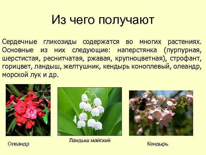 Из чего получают Сердечные гликозиды содержатся во многих растениях. Основные из них следующие: наперстянка (пурпурная, шерстистая, реснитчатая, ржавая, крупноцветная), строфант, горицвет, ландыш, желтушник, кендырь коноплевый, олеандр, морской лук и др. Олеандр Ландыш майский Кендырь