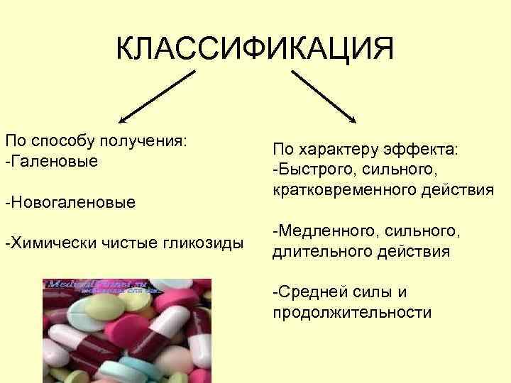 КЛАССИФИКАЦИЯ По способу получения: -Галеновые -Новогаленовые -Химически чистые гликозиды По характеру эффекта: -Быстрого, сильного, кратковременного действия -Медленного, сильного, длительного действия -Средней силы и продолжительности