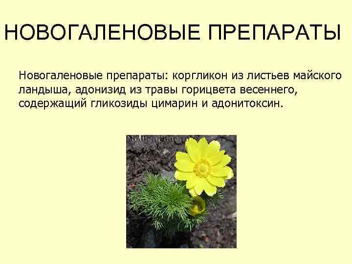 НОВОГАЛЕНОВЫЕ ПРЕПАРАТЫ Новогаленовые препараты: коргликон из листьев майского ландыша, адонизид из травы горицвета весеннего, содержащий гликозиды цимарин и адонитоксин.