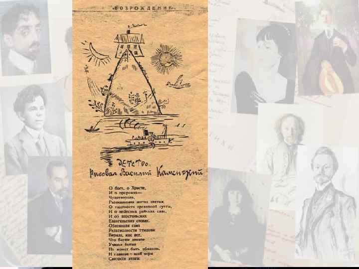 Представители «Цех поэтов» : С. Городецкий, А. Ахматова, Н. Гумилёв, О. Мандельштам, М. Зенкевич, Вл. Марбут