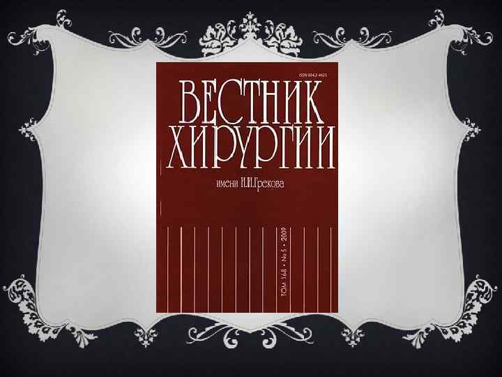 150 ПЕЧАТНЫХ НАУЧНЫХ РАБОТ v «О сшивании ран сердца» (1903), v «О лечении перитонитов» (1914), v «О лечении травматических аневризм с помощью сосудистого шва и пересадки сосудов» (1916), v «Хирургическое лечение раковых опухолей, повреждений и других заболеваний поджелудочной железы» (1922), v «О лечении повреждений грудной полости» (1924), v «Об ошибках в хирургии» (1927)