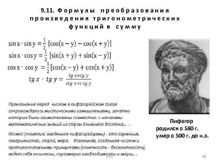 9. 11. Ф о р м у л ы п р е о б р а з о в а н и я произведения тригонометрических функций в сумму Преклонение перед числом в пифагорейском союзе сопровождалось мистическими измышлениями, зачатки которых были заимствованы совместно с началами математических знаний из стран Ближнего Востока…. Космос (понятие, введенное пифагорейцами) - это гармония, совершенство, строй, мера. Вселенная, созданная числом и противоположными принципами (конечность - бесконечность), ведет себя логически, соразмерно необходимости и меры…. 1 -51 Пифагор родился в 580 г. умер в 500 г. до н. э. 38