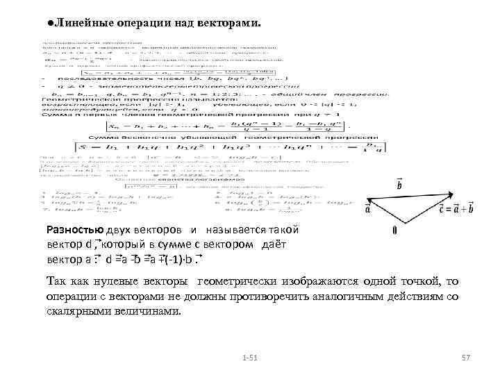 ●Линейные операции над векторами. Разностью двух векторов и называется такой вектор d , который в сумме с вектором даёт вектор a =a (-1)∙b : d -b +. Так как нулевые векторы геометрически изображаются одной точкой, то операции с векторами не должны противоречить аналогичным действиям со скалярными величинами. 1 -51 57