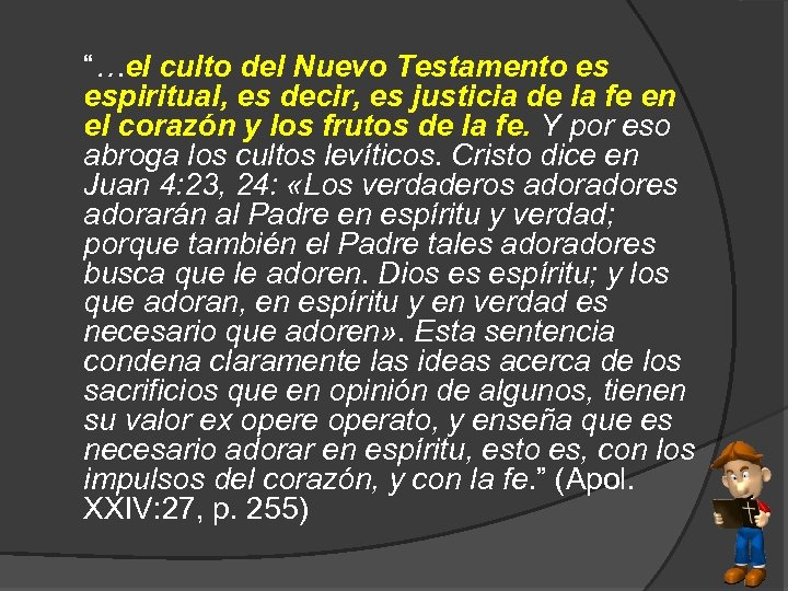 “…el culto del Nuevo Testamento es espiritual, es decir, es justicia de la fe en el corazón y los frutos de la fe. Y por eso abroga los cultos levíticos. Cristo dice en Juan 4: 23, 24: «Los verdaderos adores adorarán al Padre en espíritu y verdad; porque también el Padre tales adores busca que le adoren. Dios es espíritu; y los que adoran, en espíritu y en verdad es necesario que adoren» . Esta sentencia condena claramente las ideas acerca de los sacrificios que en opinión de algunos, tienen su valor ex opere operato, y enseña que es necesario adorar en espíritu, esto es, con los impulsos del corazón, y con la fe. ” (Apol. XXIV: 27, p. 255)